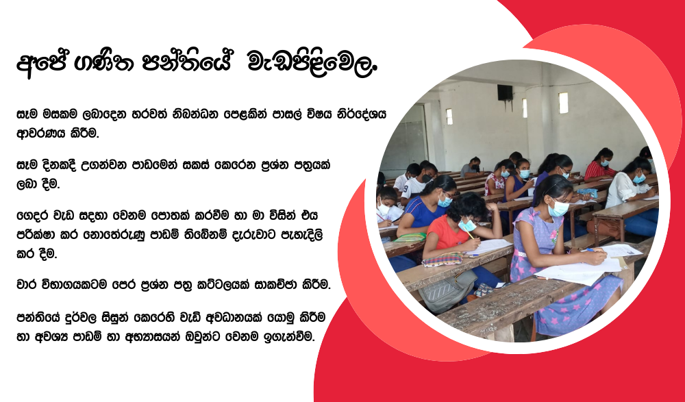 ගුණාත්මක අධ්යාපනයක් ලබාදී ගණිත විෂයය අසමත් නොවීA,B,C සාමාර්ථයන් ඔවුන් හට ලබා ගැනීමට මගපෙන්වීමට ගුරුවරයෙකු ලෙස මාහට හැකි විය.